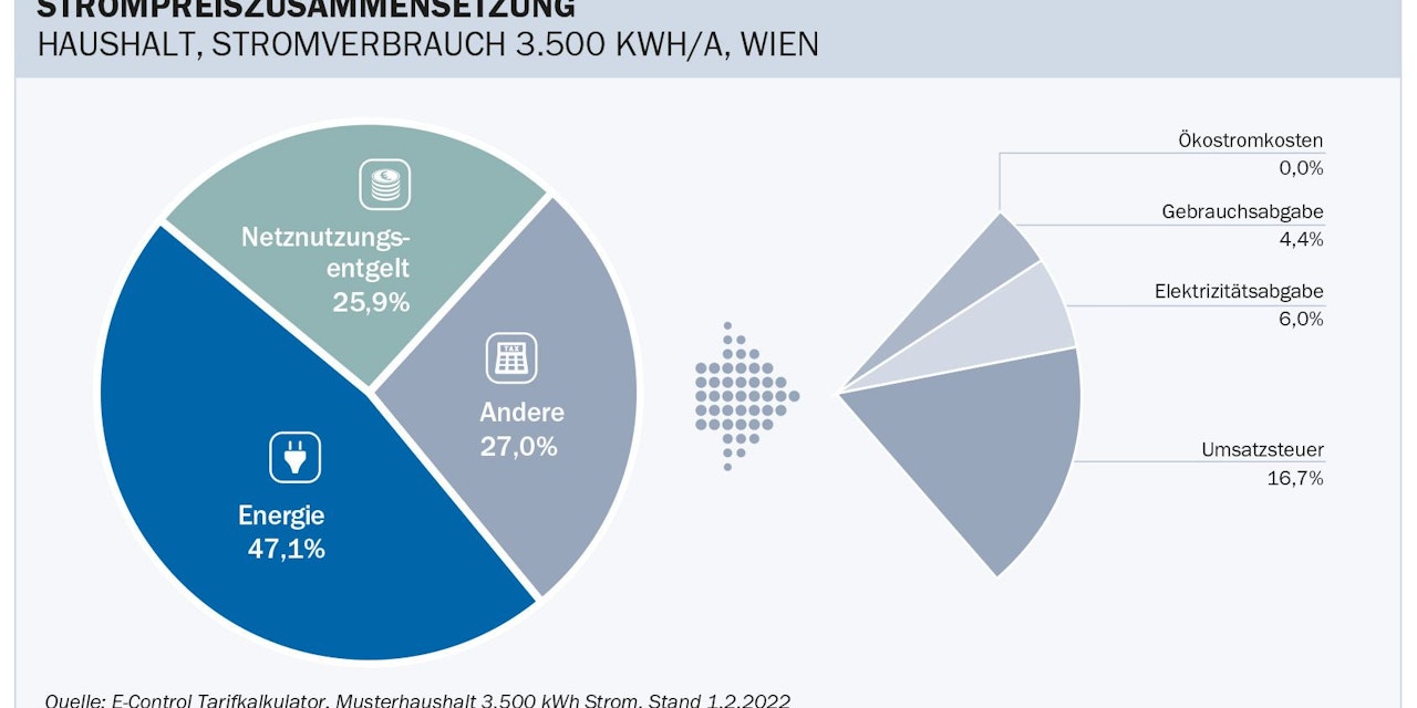 Strompreiszusammensetzung eines Wiener Haushaltes, E-Control-Beispiel mit Stand 1.2.2022.