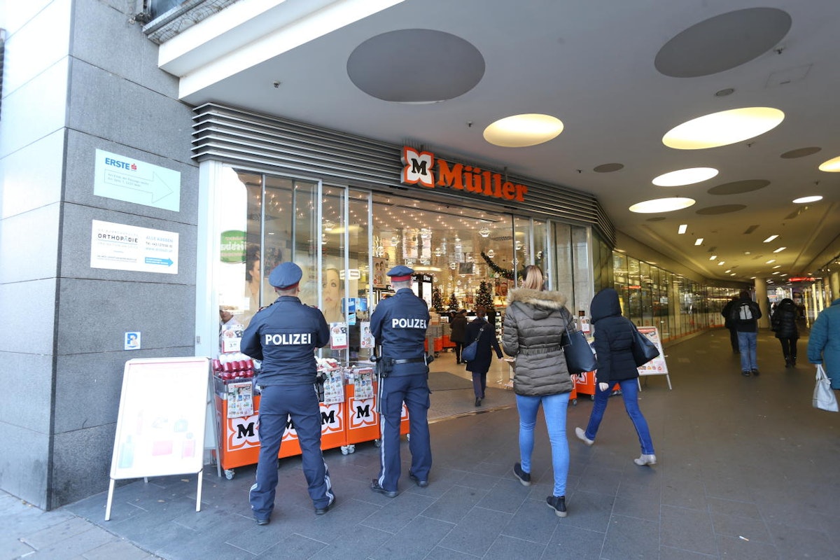 Eine Müller-Filiale in Wien-Floridsdorf steht unter Polizeischutz.