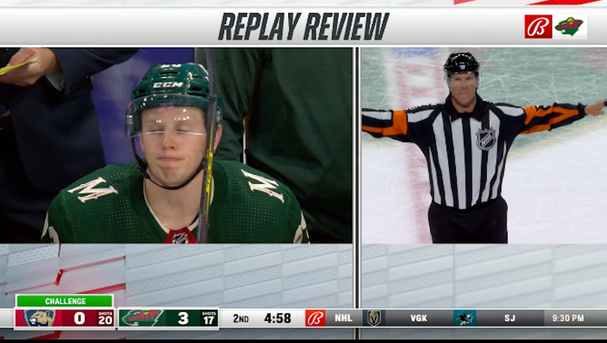 3 /4 Der Wild-Angreifer ist Zentimeter zu früh im Angriffsdrittel, dann kommt erst der Puck nach. Wegen Abseits zählt das spätere Traumtor von Rossi nicht.