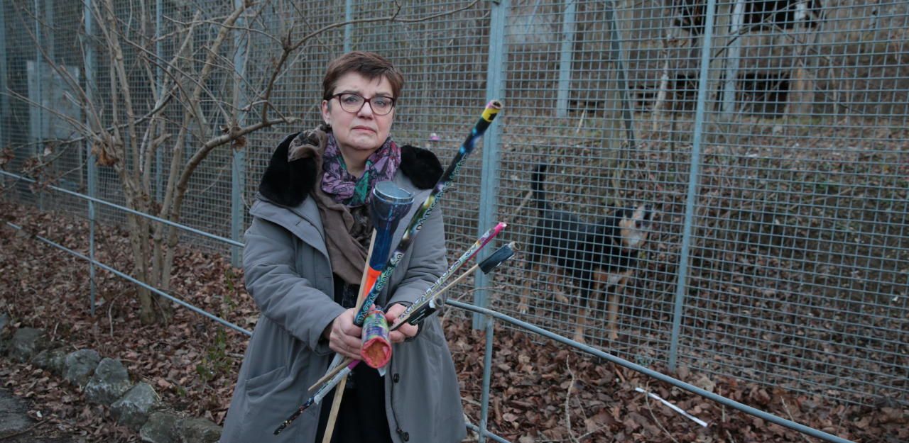 Madeleine Petrovic, Präsidentin des Tierschutzvereins, mit Raketen-Resten und einem der panischen Hunde im Hintergrund.