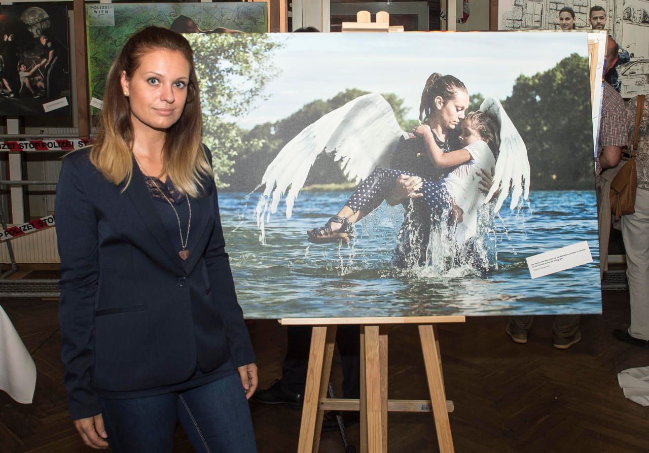 Revierinspektorin Ines L. (31) vor ihrem Foto im Wiener Polizeikalender 2018