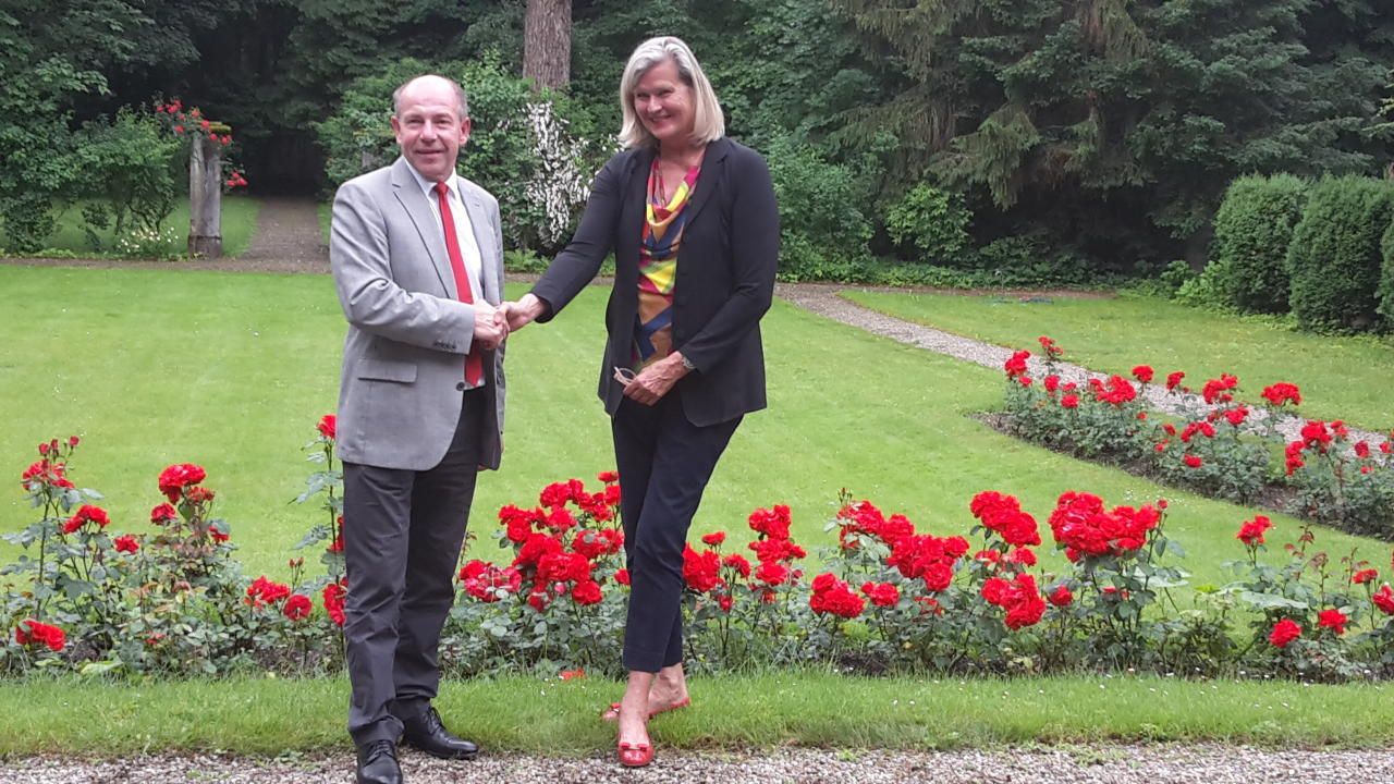 Trotz Größenunterschied, auf Augenhöhe. Kein Wunder bei dem kitschig-romantischen Hintergrund: Landesrat Max Hiegelsberger und Botschafterin Ursula Plassnik im Rosengarten der Schweizer Botschaft. Die Botschafterin für Österreich diesmal in eher unaufgeregten roten Schuhen und ohne Ohrschmuck.