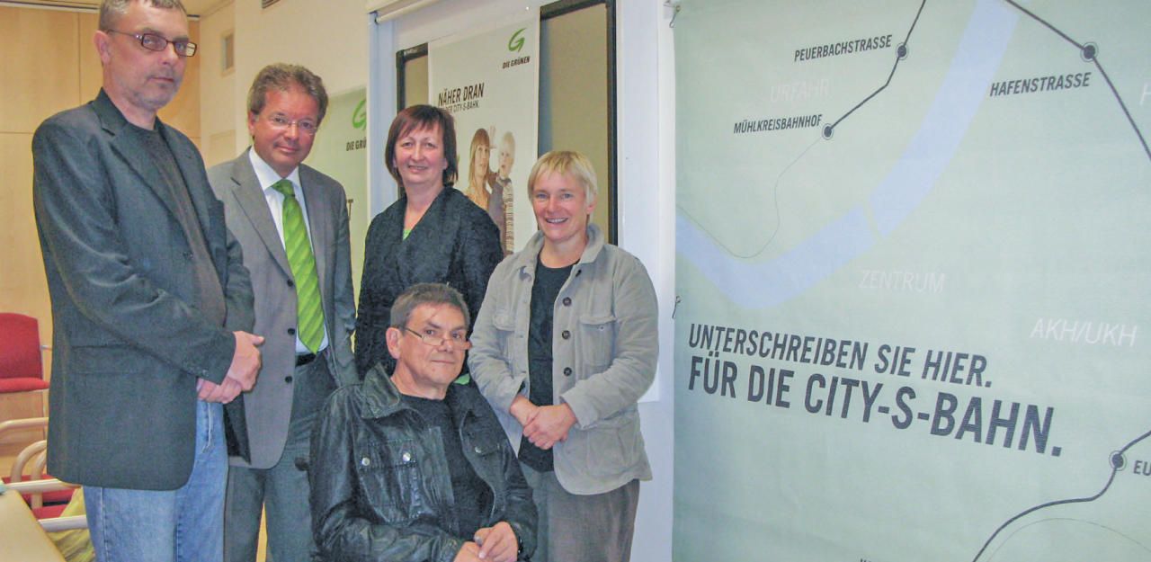 Die Grünen präsentierten die City-S-Bahn bereits 2007 (v.li.): der inzwischen verstorbene Jürgen Himmelbauer, Landesrat Rudi Anschober, Landtagsabgeordnete Ulrike Schwarz, Landtagsabgeordnete Uli Böker (damals Bürgermeisterin von Ottensheim) und der damalige Grünen-Verkehrssprecher Gunther Trübswasser.
