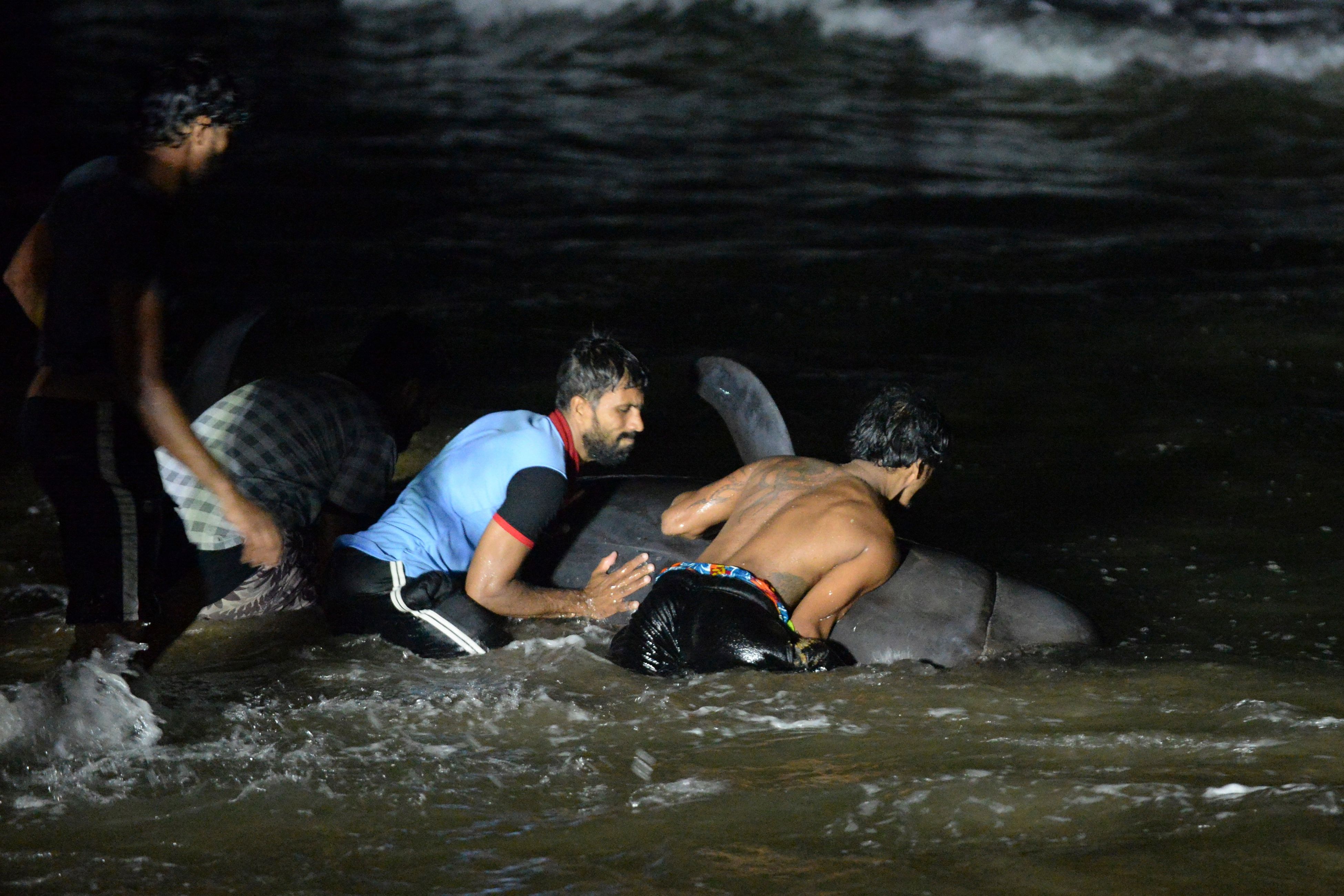 Mehrere Freiwillige und Marinesoldaten retteten 120 gestrandete Grindwale an der Küste Sri Lankas.