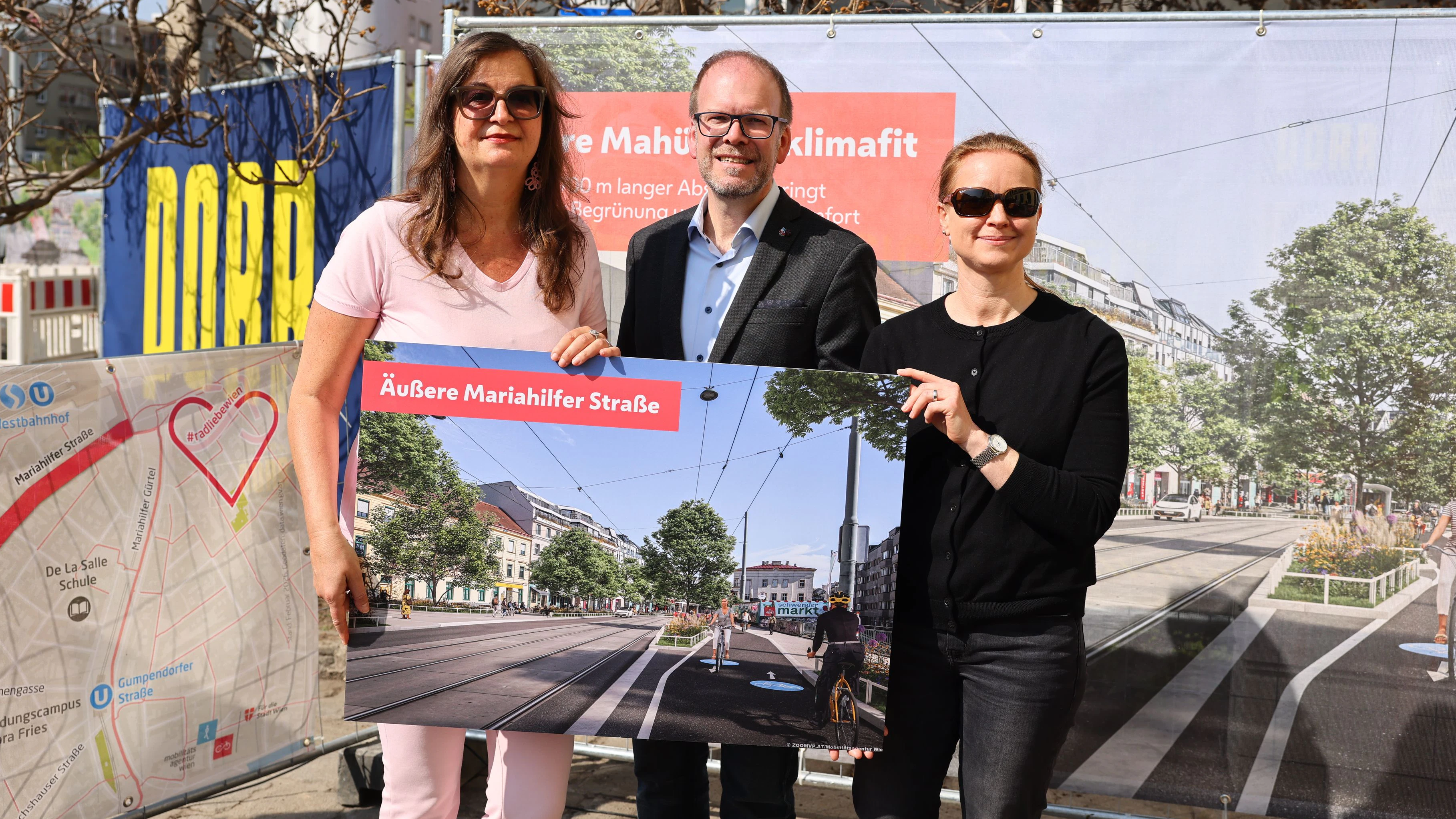 Mobilitätsstadträtin Ulli Sima, Bezirksvorsteher von Rudolfsheim-Fünfhaus, Dietmar Baurecht und NEOS-Mobilitätssprecherin Angelika Pipal-Leixner (v.l.).