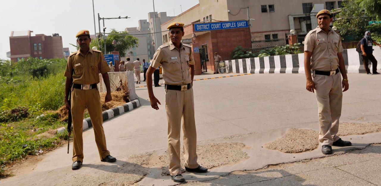 Indische Polizisten stehen Wache vor einem Gerichtsgebäude in Neu-Delhi.