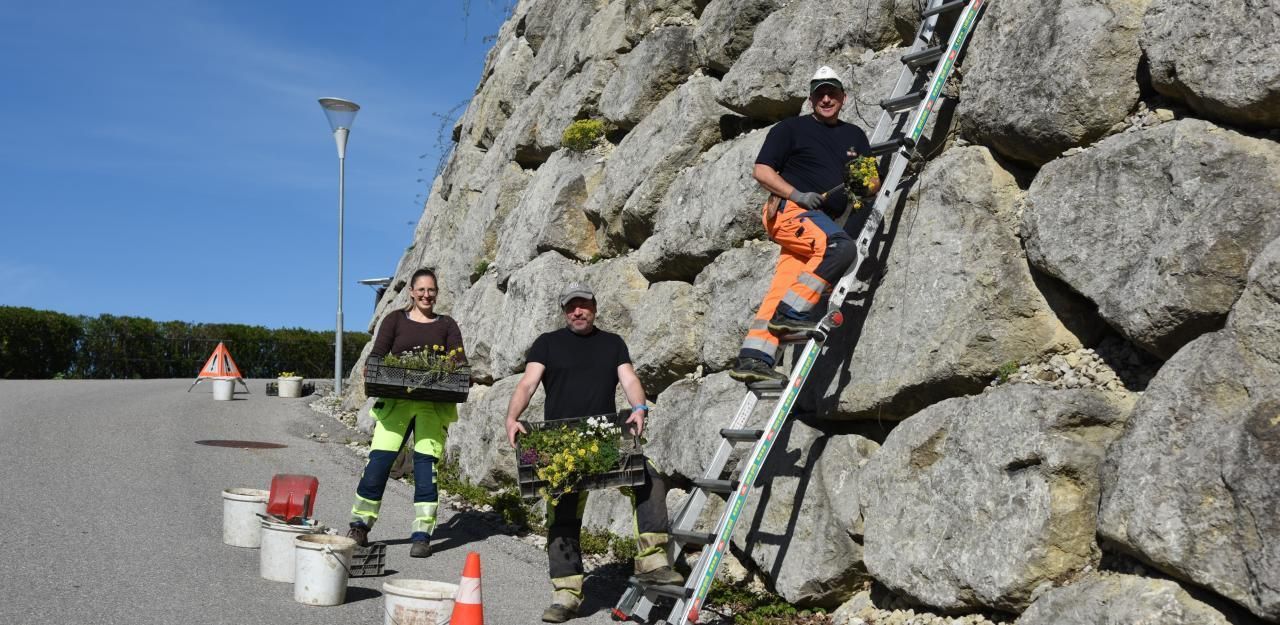 Alexandra Bacher und Wolfgang Kettner (r.), beide zuständig für die Grünanlagen, pflanzen mit Stadtgärtner Jan-Michael Fabian (M.) die ersten Blumen.