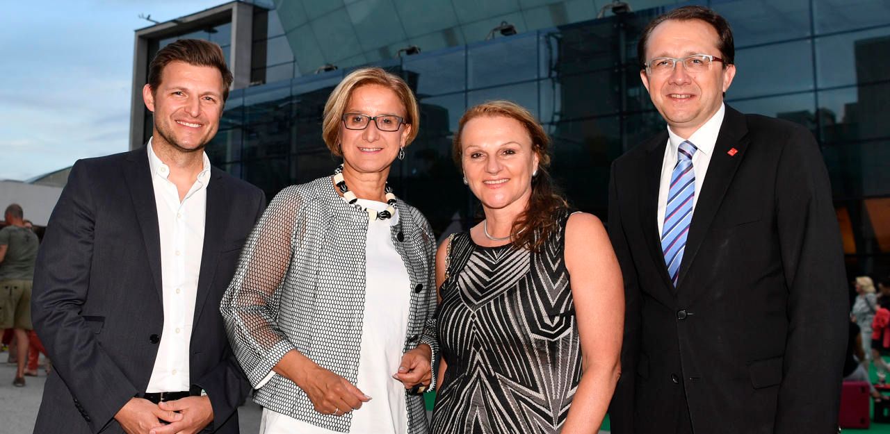 Freuen sich über 20 Jahre Festspielhaus St. Pölten: Geschäftsführer Thomas Gludovatz, Landeshauptfrau Johanna Mikl-Leitner, die künstlerische Leiterin Brigitte Fürle und St. Pöltens Bürgermeister Matthias Stadler.