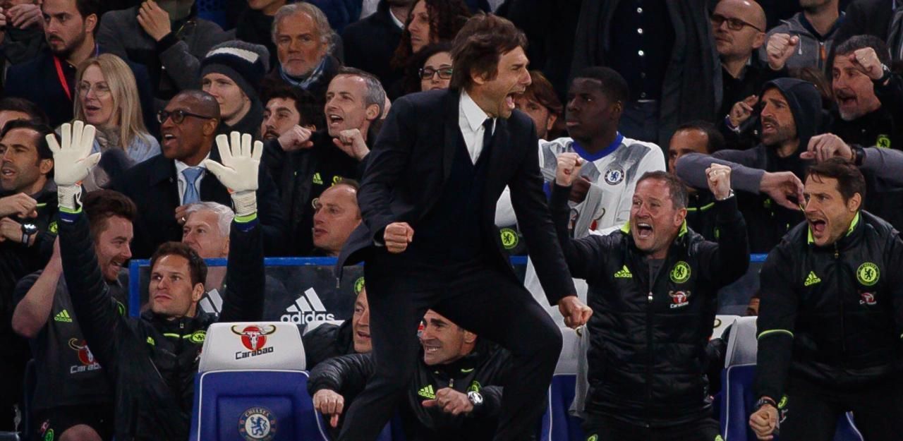 Chelsea-Coach Antonio Conte zeigt eindrucksvoll, was man unter einem ausgelassenen Jubel versteht.