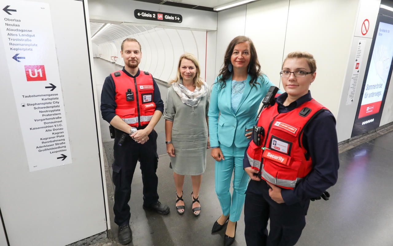 Öffi-Stadträtin Ulli Sima (2.v.re.) und Wiener Linien-Geschäftsführerin Alexandra Reinagl (2.v.li) zogen nun Bilanz über ein Jahr "Wiener Linien Sicherheitsmitarbeiter"(c) PID/Christian Fürthner