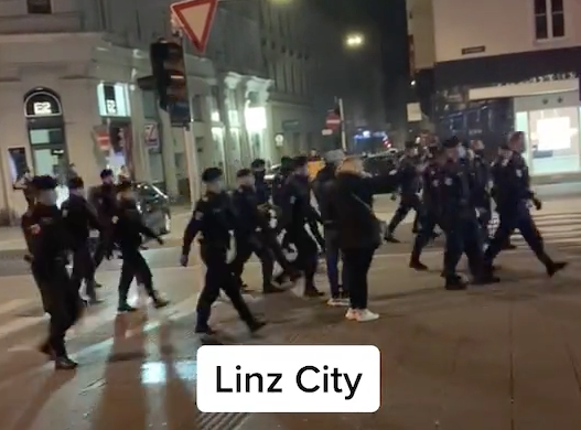 30 Polizisten marschieren Richtung der Ordnungsstörer.