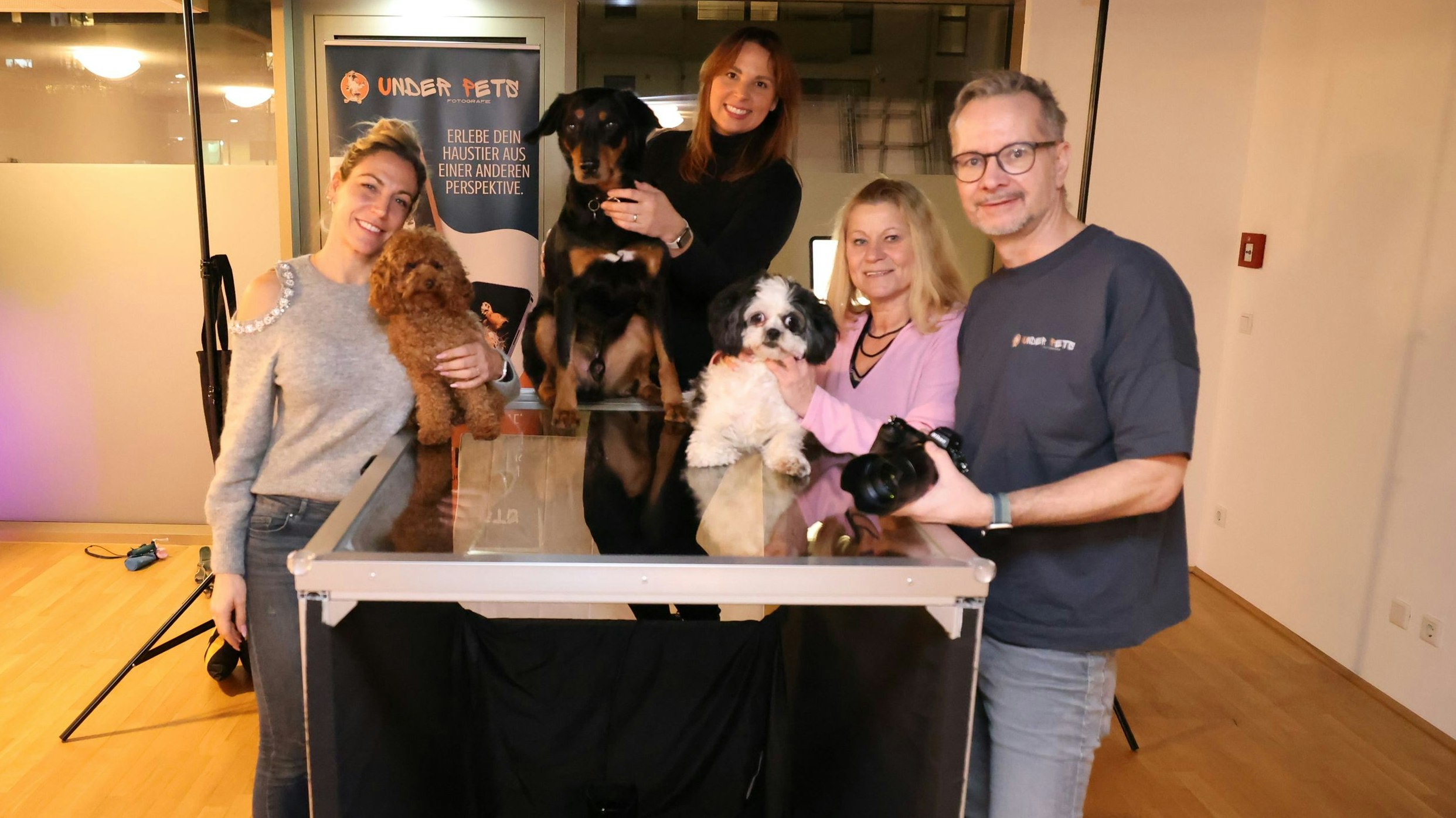 Fotograf Jürgen Pricken (re.) mit Raphaela und Maggie (li.), Kathi und Nio (Mitte) und Larissa und Noe (2.v.re.).