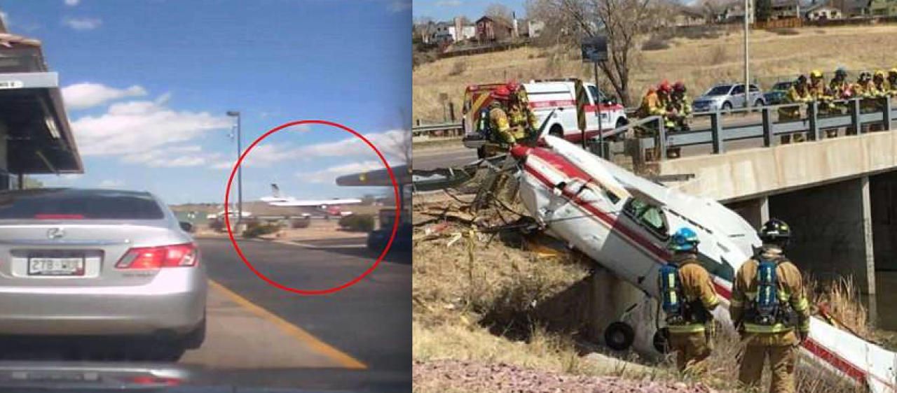 Wunder: Das Flugzeug (Kreis) schießt über den Highway, ohne ein Auto zu rammen, und landete in einem Flussbett. Nur eine Person wurde leicht verletzt.