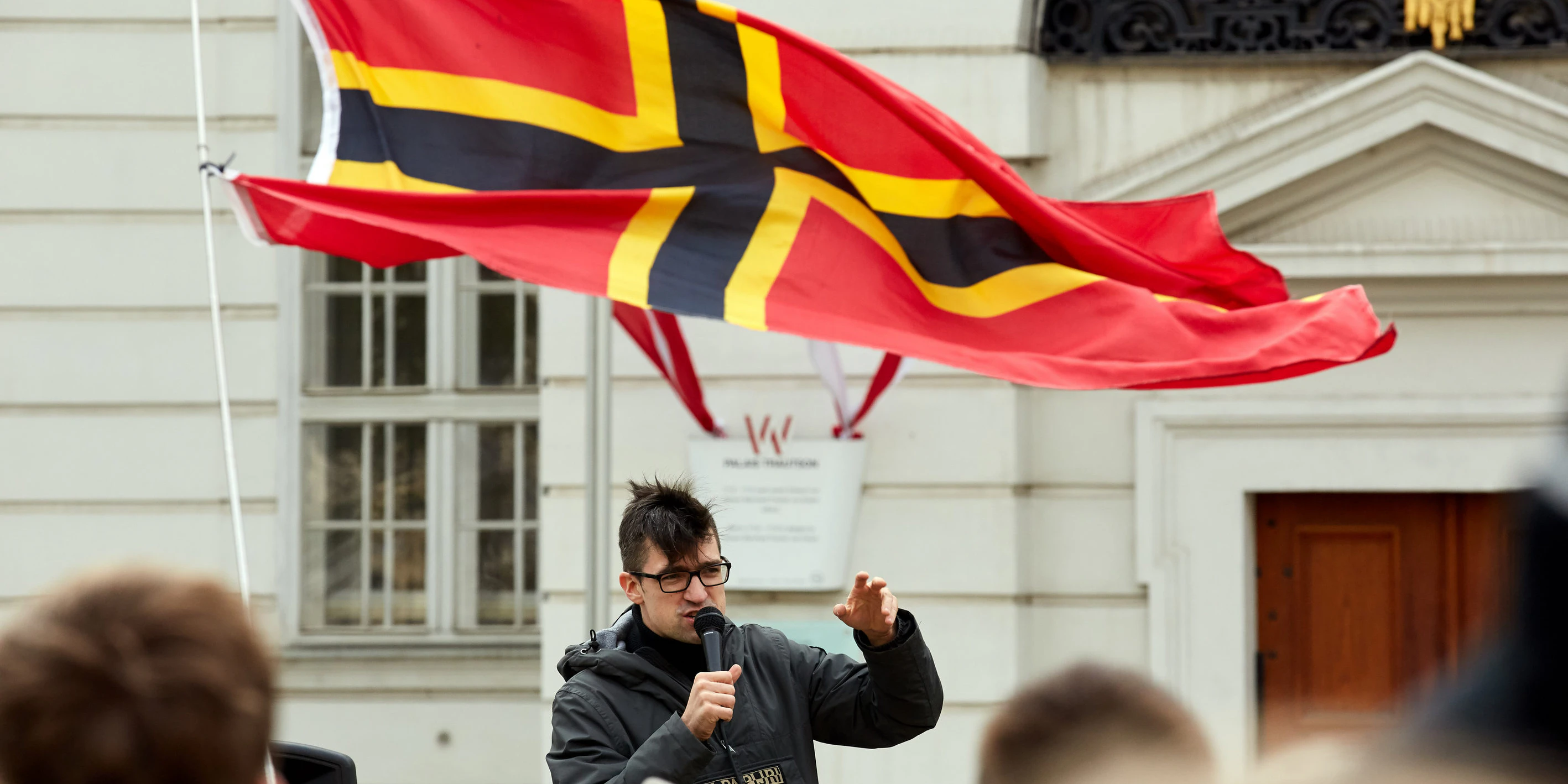 Martin Sellner, Kopf der Identitären, über ihm die oft von deutschnationalen Gruppierungen verwendete Wirmer-Fahne.