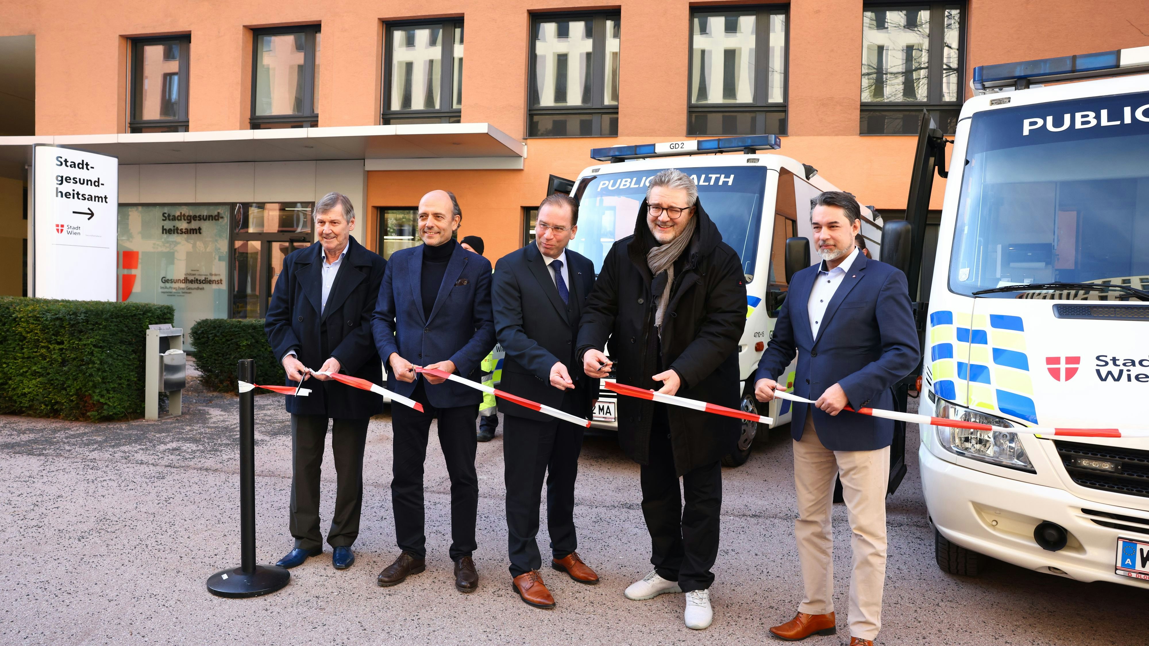Landstraßer Bezirksvorsteher Erich Hohenberger (SPÖ), Neos-Wien-Gesundheitssprecher Stefan Gara, Berufsrettungs-Leiter Rainer Gottwald, Gesundheitsstadtrat Peter Hacker (SPÖ) und Gesundheitsdienst-Abteilungsleiter Jochen Haidvogel (v.l.) eröffneten am Dienstag das neue Stadtgesundheitsamt in Wien-Landstraße.