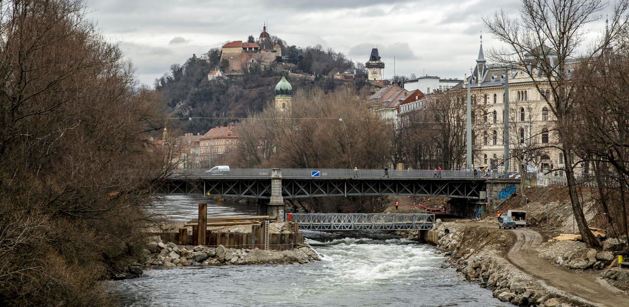 Bau des Murkraftwerks in Graz, im Bild eine Baustelle des neuen Murkraftwerks mit Errichtung des Speicherkanals in Graz beim Augarten am 01. Februar 2018.