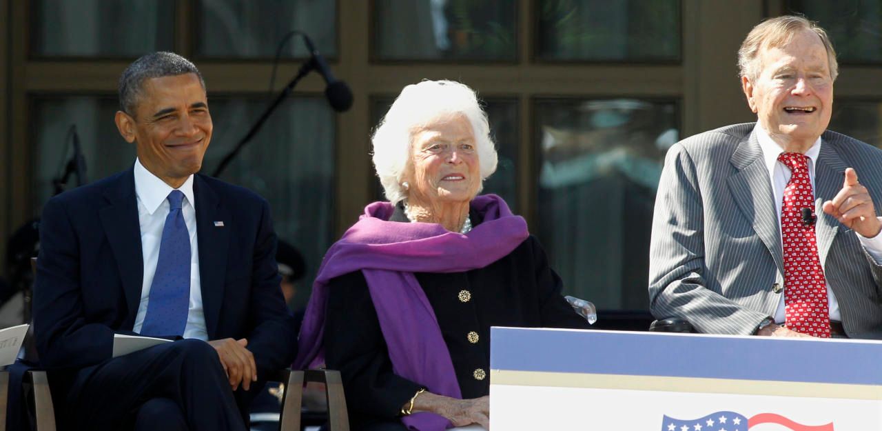 Barbara Bush zwischen ihrem Ehemann George H.W. Bush und dem damaligen US-Präsidenten Barack Obama