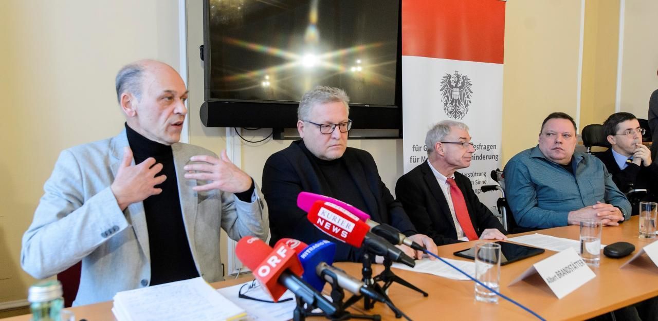 Sie klagen: Peter Schlaffer von der Organisation Vertretungsnetz, Albert Brandstätter, der Generalsekretaer der Lebenshilfe, Behindertenanwalt Hansjörg Hofer, Herbert Pichler, der Präsident des Behindertenrats und Martin Ladstätter vom Verein "Selbstbestimmt Leben".