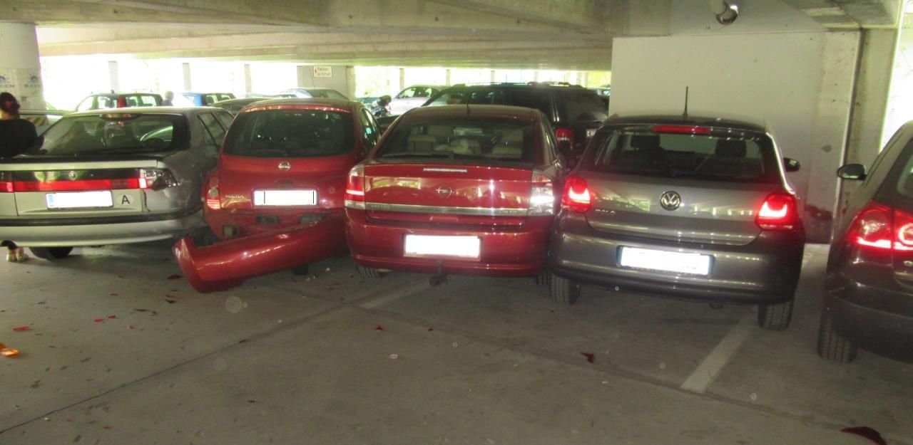 Der Pkw des Unfalllenkers (g. li.) und mehrere beschädigte Autos im Parkdeck Römertherme in Baden.