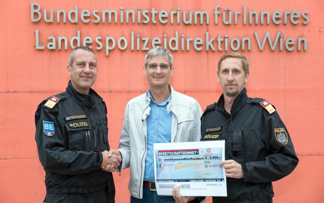 Kommandant der Bereitschaftseinheit, Oberstleutnant Ihle (links) und sein Stellvertreter Oberstleutnant Lischka (rechts) überreichen Mag. Harald Jankovits von der Kinderhospiz Sterntalerhof den Spendenscheck in Höhe von 2500 Euro.