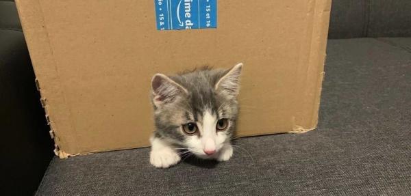 Die "Baby Katze" unseres Sohnes beim Spielen mit einem Karton.