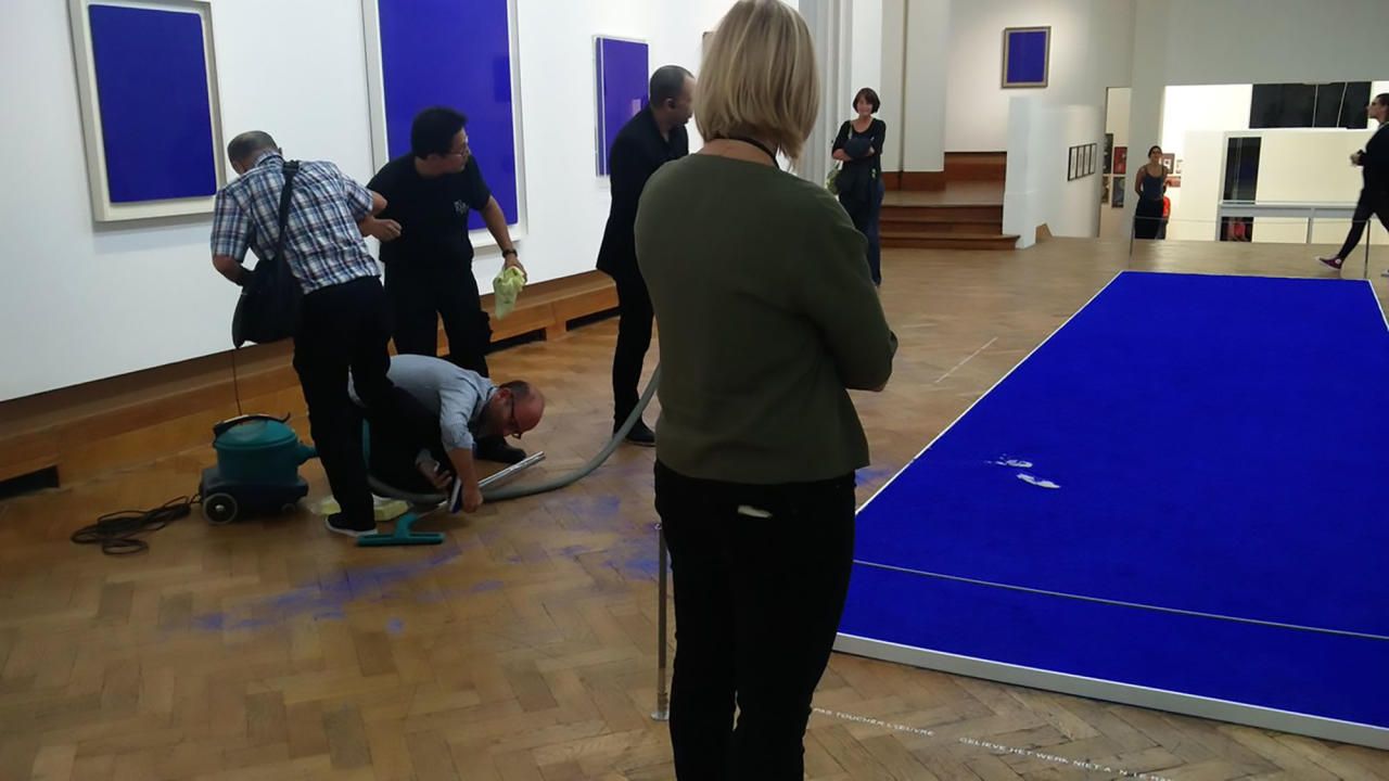 Infarkt-Alarm bei der Museumsleitung im "Bozar" in Brüssel: Der Besucher ist in das Kunstwerk gestolpert und hat die blaue Farbe im Gebäude verteilt!
