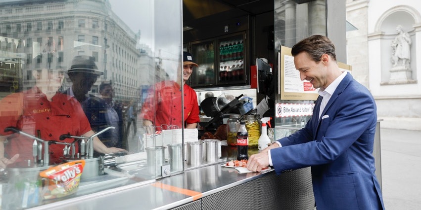 Finanzminister Gernot Blümel zu Besuch bei Bitzingers Würstelstand.