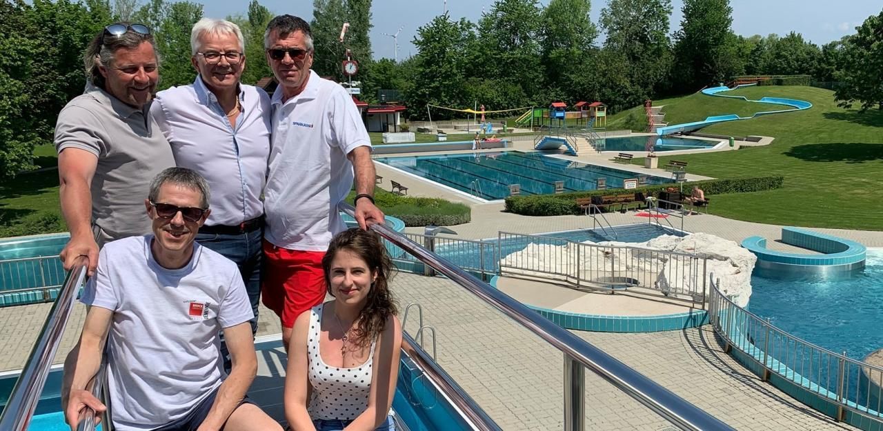Roman Brunnthaler (l.) mit Bürgermeister Gerhard Weil (M.) im Parkbad Bruck.