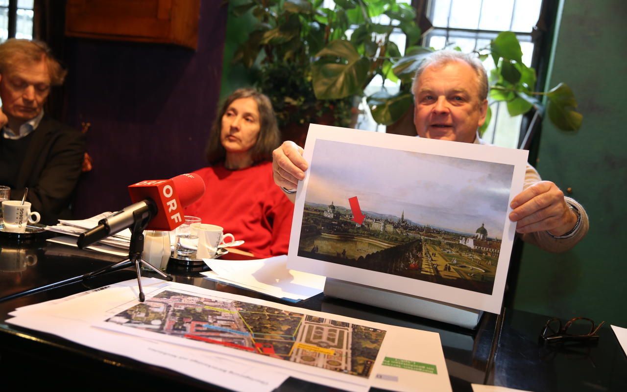 Die Bürgerinitiative "Nein zum permanenten Oktoberfest beim Belvedere" wehrt sich weiter gegen das, wie sie sagen, "überdimensionierte" Belvedere Stöckl (v.l.n.r.: Architekt Ralf Bock, ao. TU Wien-Professorin Eva Berger und der Sprecher der Initiative Hellmut Schneider). Der rote Pfeil auf dem Bild zeigt die Lage des "Stöckl" im Ensemble.