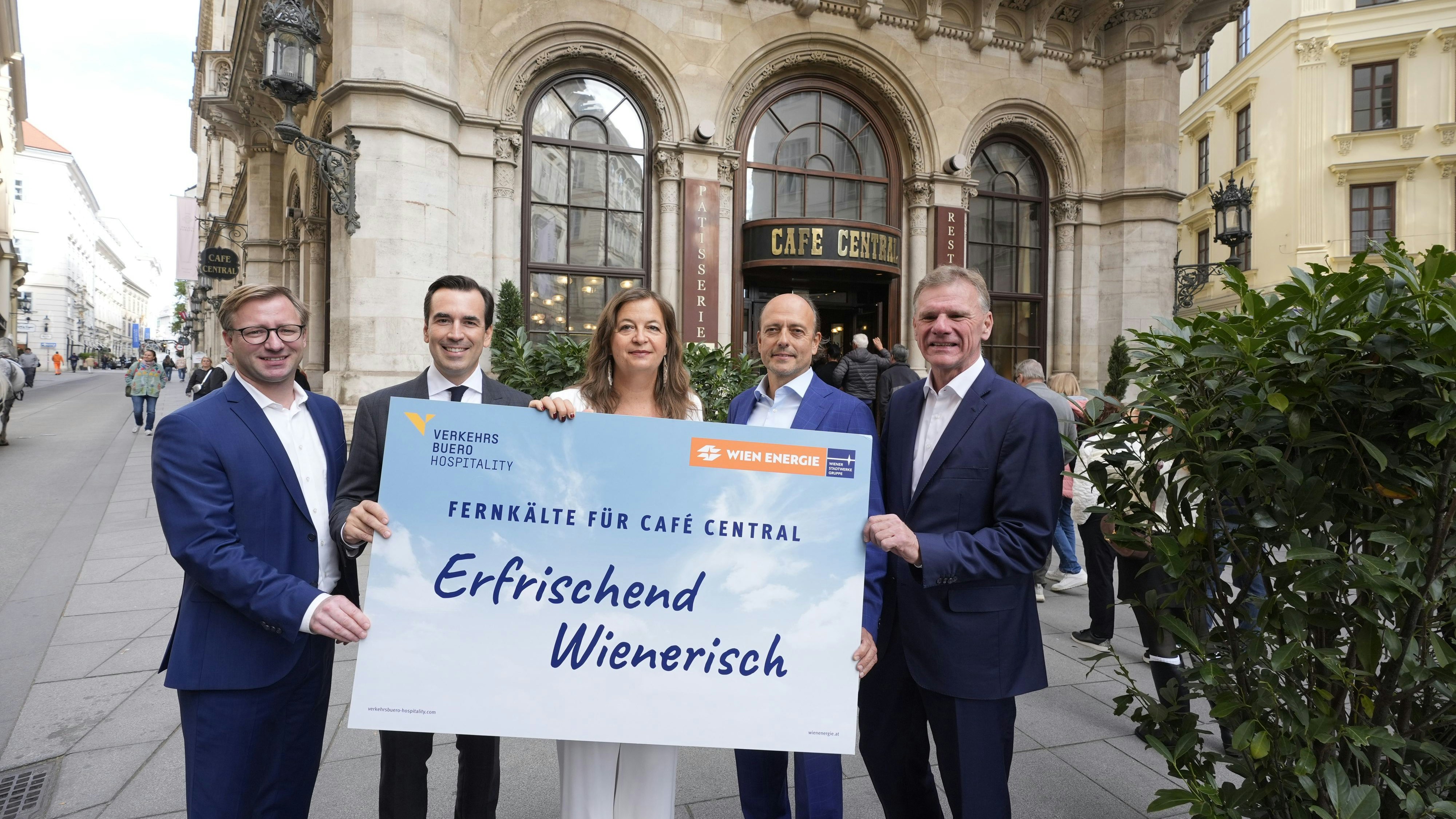 Kay Fröhlich, Geschäftsführer Verkehrsbuero, Martin Winkler, Vorsitzender des Vorstandes Verkehrsbuero, Stadträtin Ulli Sima, Stefan Gara, Klimasprecher NEOS Wien und Michael Strebl, Vorsitzender der Geschäftsführung von Wien Energie (v.l.)