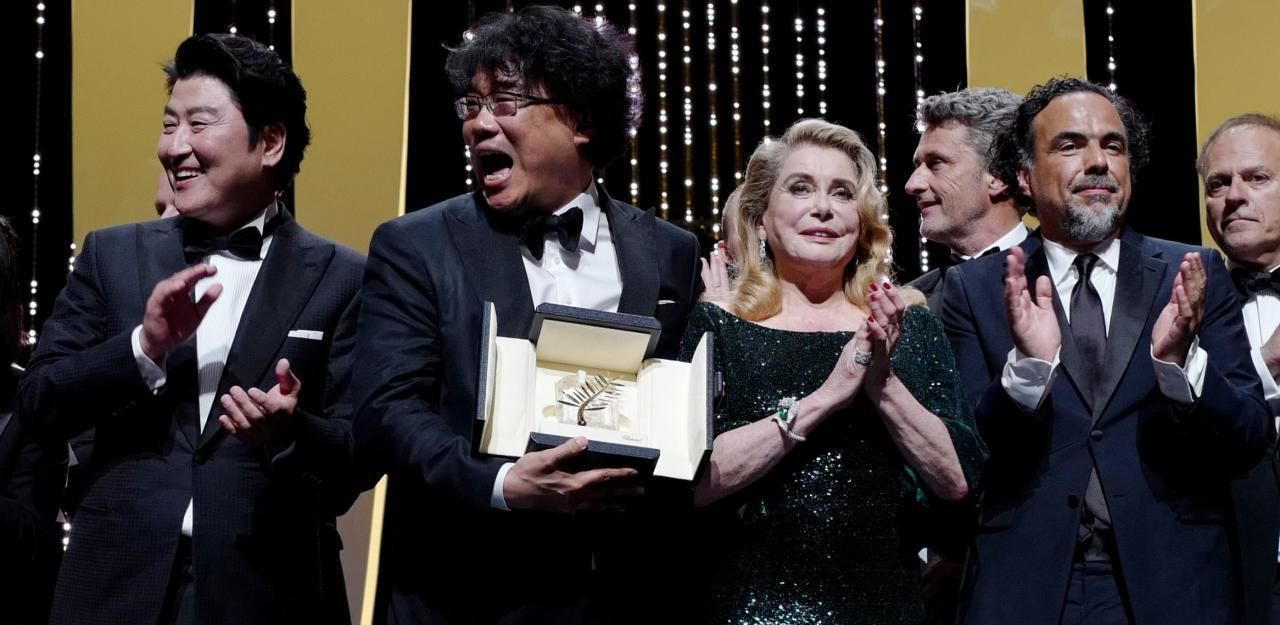 Regisseur Bong Joon-Ho (2.v.l.) strahlt vor Freude über die Goldene Palme.
