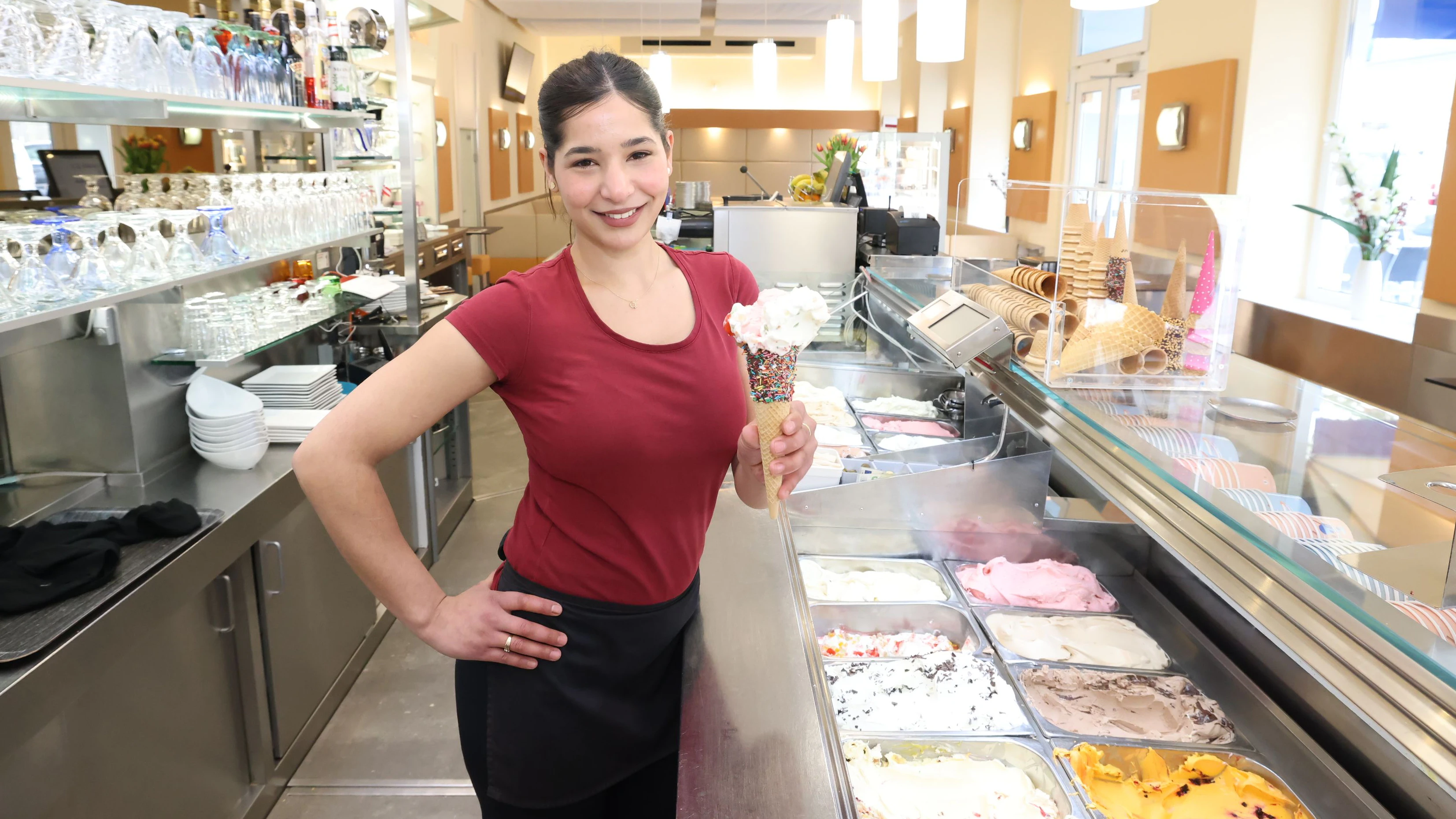 Verkäuferin Viki vom Eissalon Mauß mit einer Tüte Cassata spezial, Torrone und Erdbeer-Rahm.