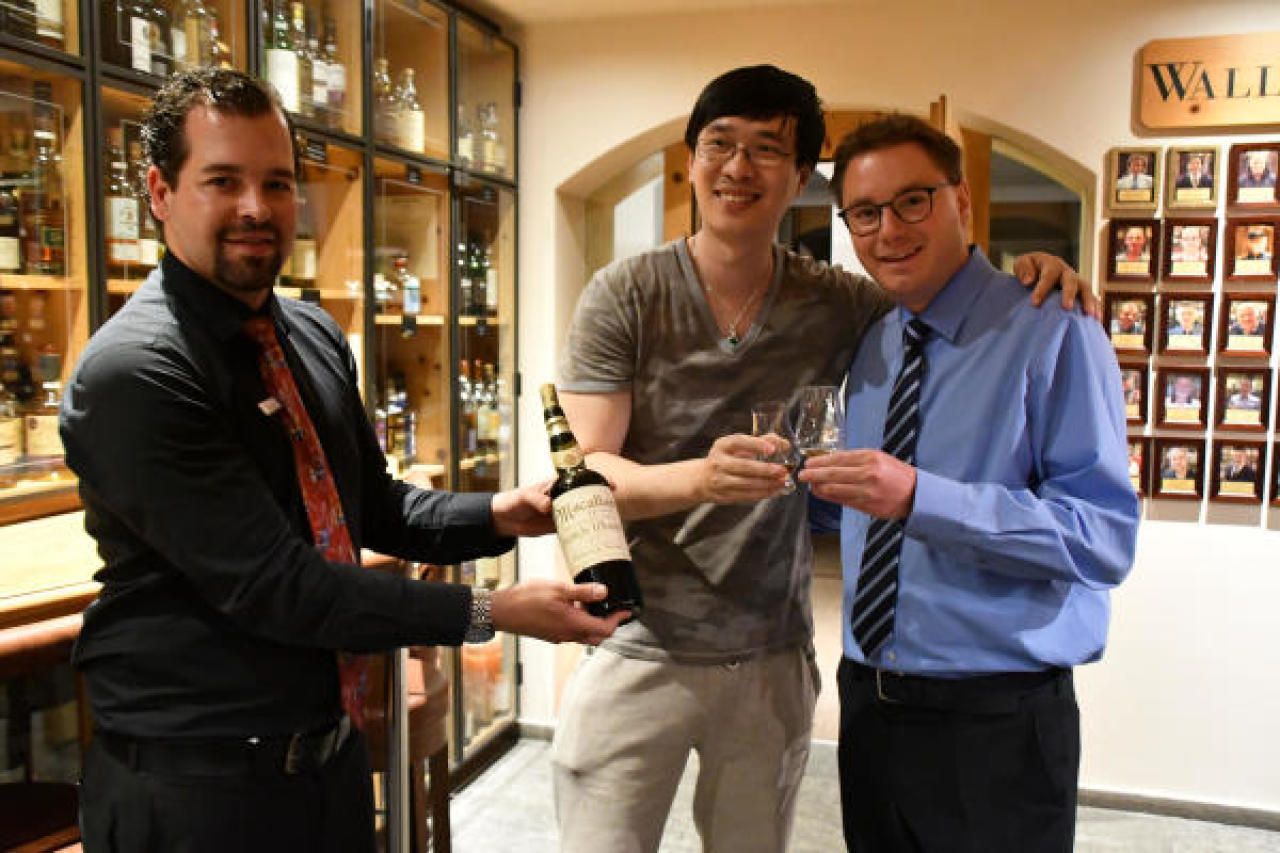 Prost: Der Gast aus China (Bildmitte) und Hotelier Sandro Bernasconi (rechts). Der Macallan-Sammler aus Asien hat sich soeben in einem Schweizer Hotel ein Glas Whisky für 8.700 Euro gegönnt.