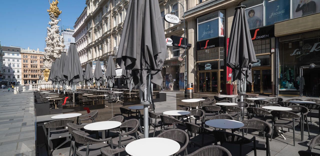 Wien, Graben: Gesperrte Gastgärten wegen Ausgangsbeschränkung gegen die Ausbreitung des Coronavirus. Vor allem die Gastronomie verzeichnet gewaltige EInbußen.