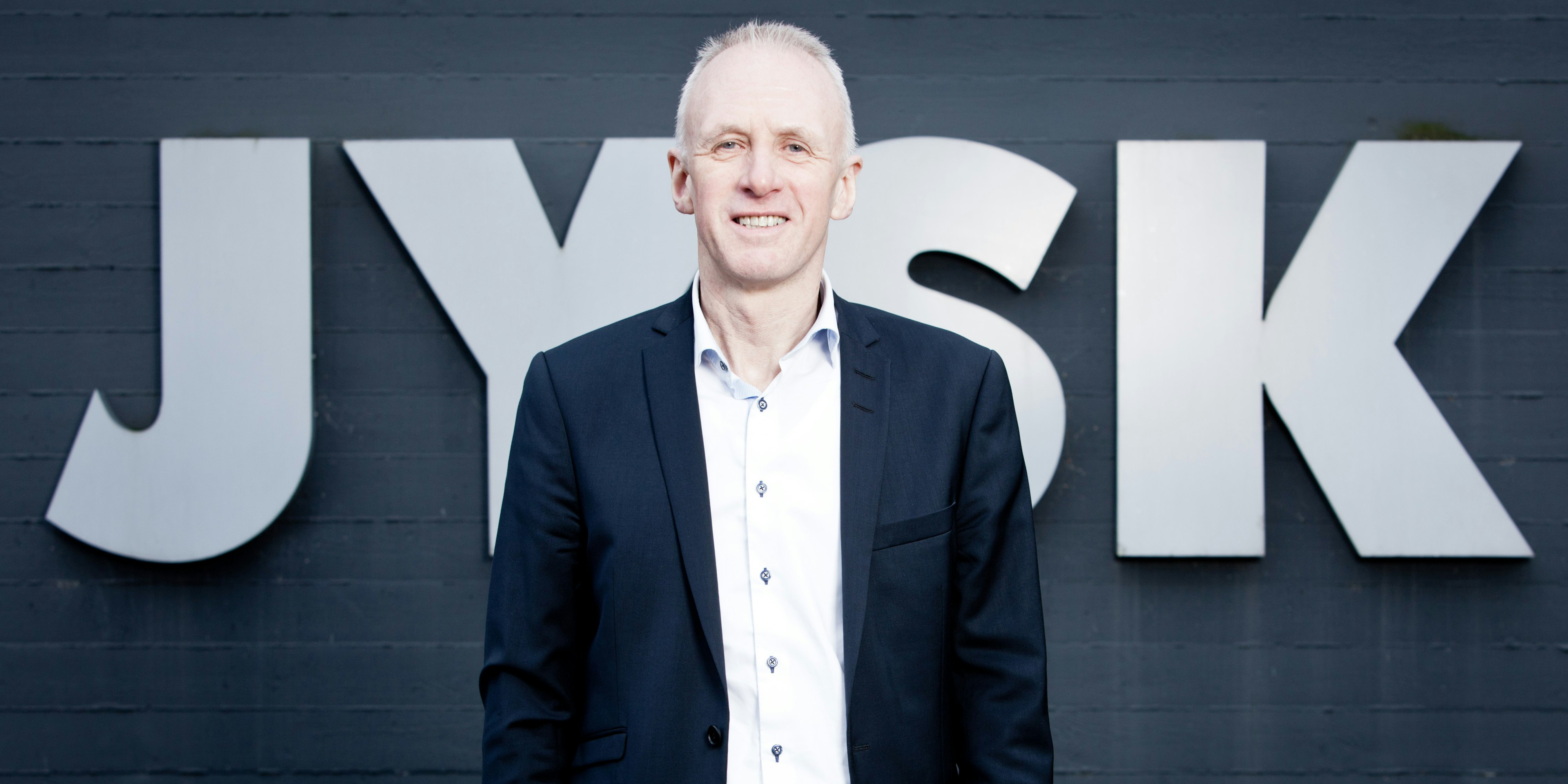 Jan Bõgh (CEO) vor dem "Jysk"-Logo.
