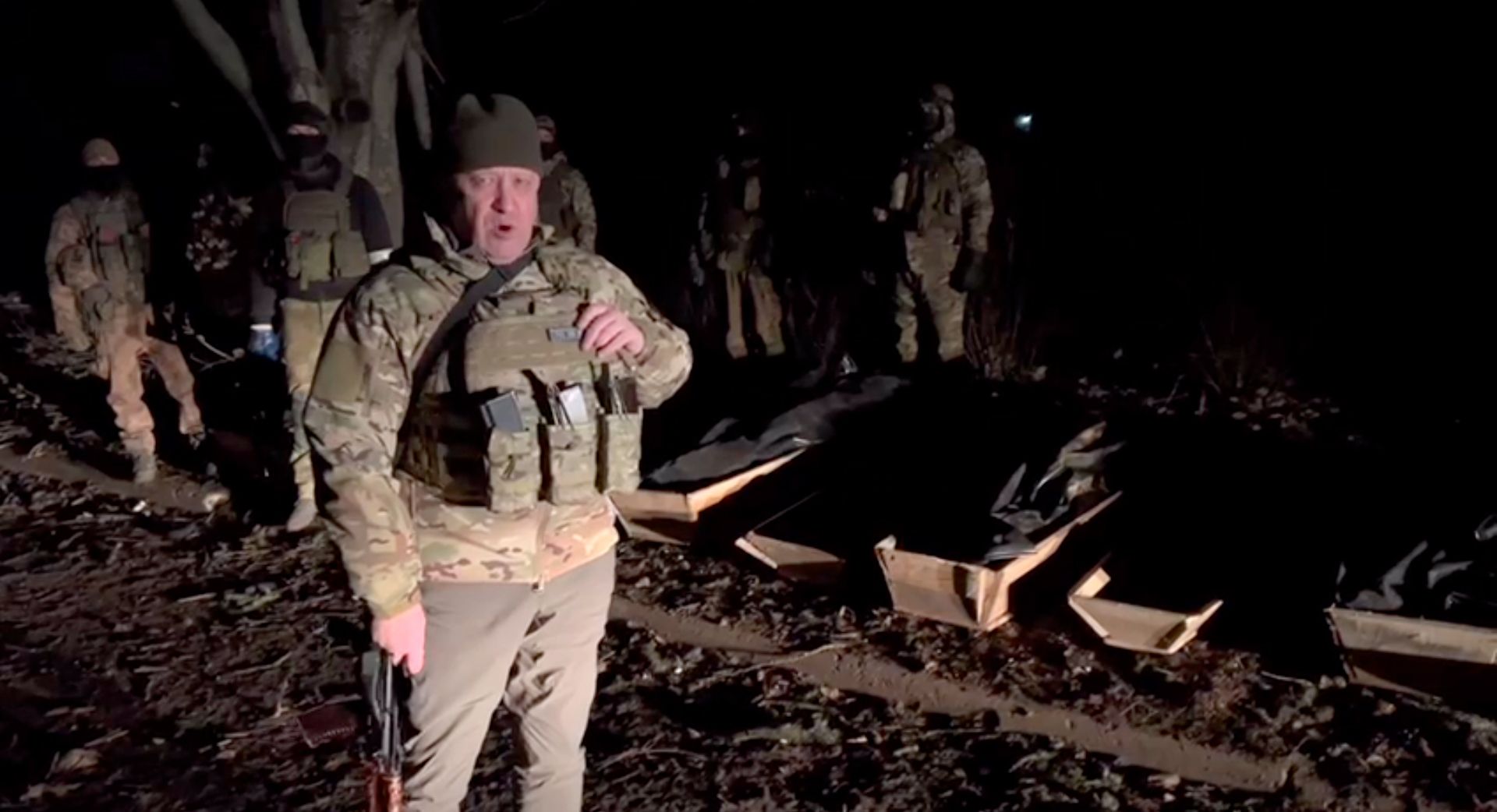 Jewgeni Prigoschin posiert vor Leichensäcken und Särgen während einer Videobotschaft vom 4. März 2023.