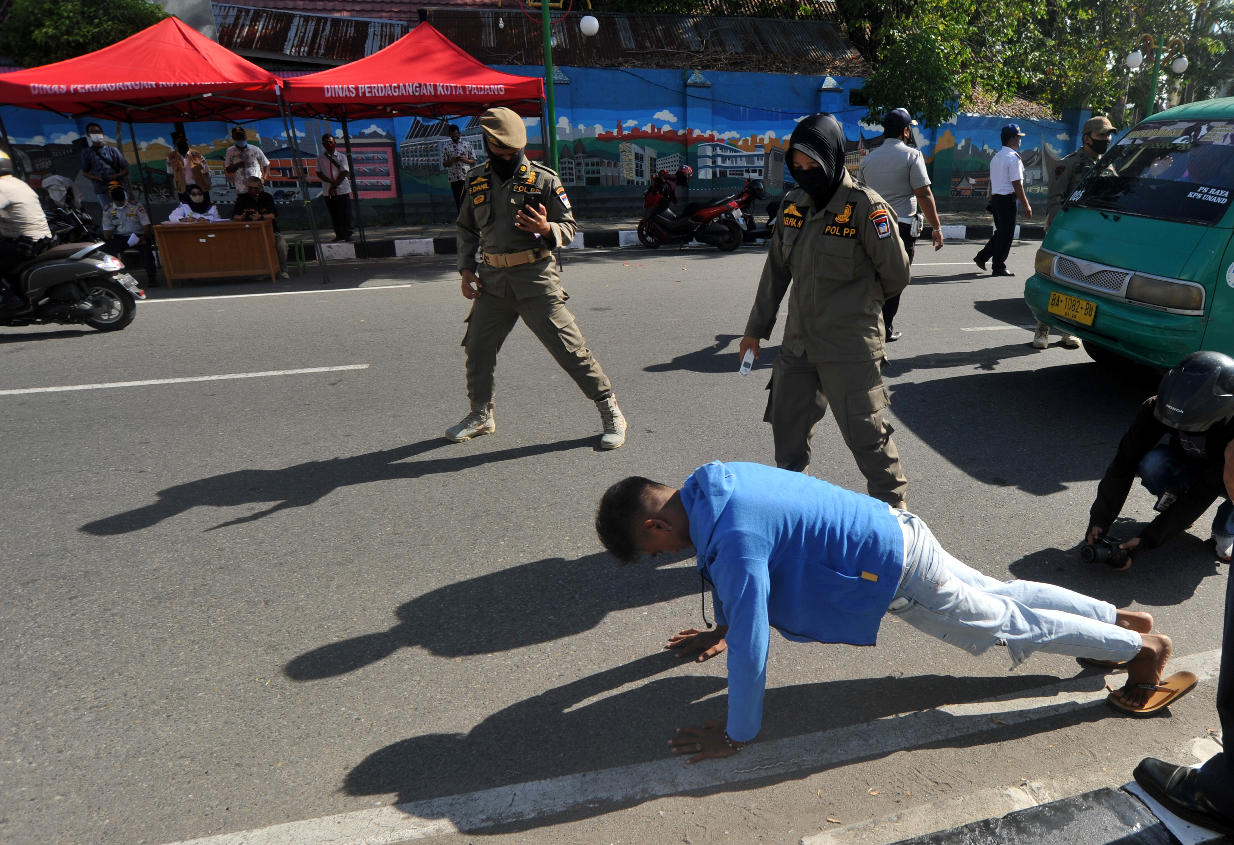 Leibesübungen als Strafe für das Nicht-Tragen einer Schutzmaske in Indonesien. (15. Mai 2020)