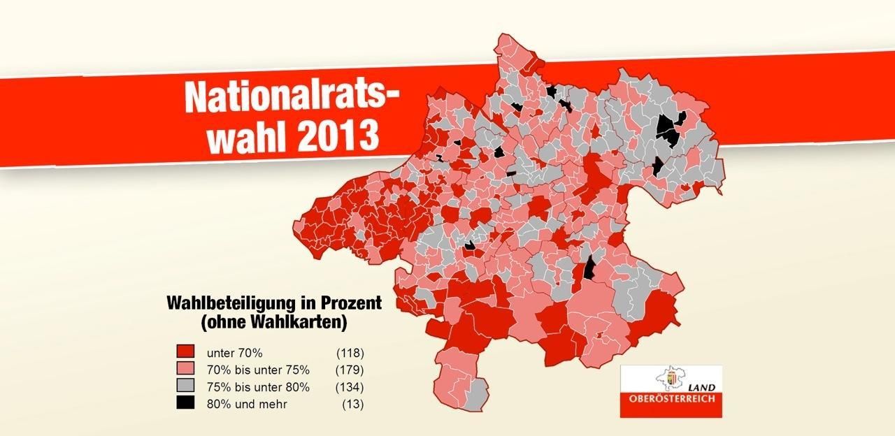 Die Karte zeigt, wie hoch der Nichtwähler-Anteil in den einzelnen oö. Gemeinden bei der Nationalratswahl 2013 war.