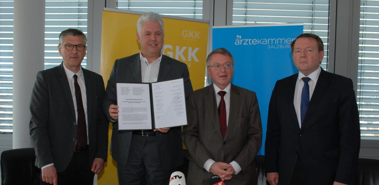 Obmann Manfred Brunner, von der Gebietskrankenkasse Vorarlberg, Obmann Andreas Huss, von der Gebietskrankenkasse Salzburg, Dr. Karl Forstner, Präsident der Ärztekammer Salzburg und OMR Dr. Thomas Fiedler, Vize-Präsident der Ärztekammer Oberösterreich präsentieren stolz die gemeinsame "Salzburger Deklaration".