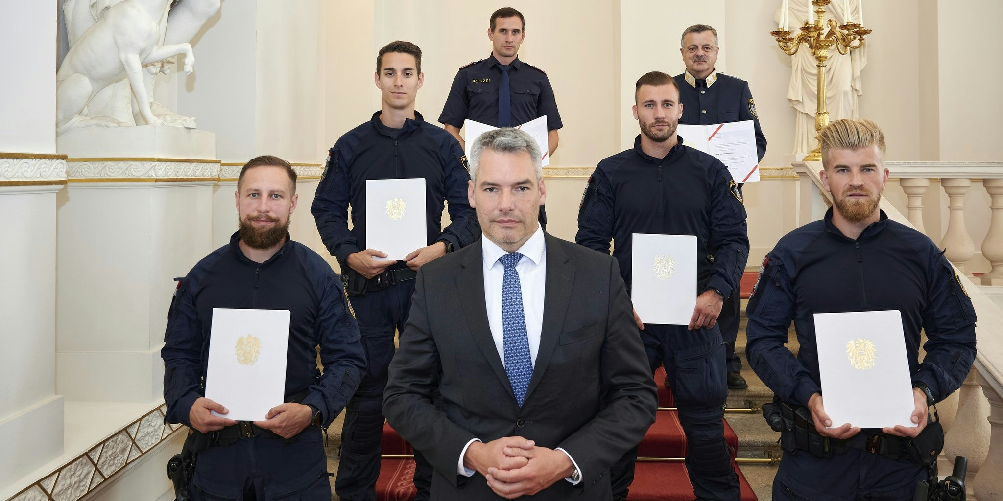 Innenminister Nehammer mit den geehrten Polizisten.