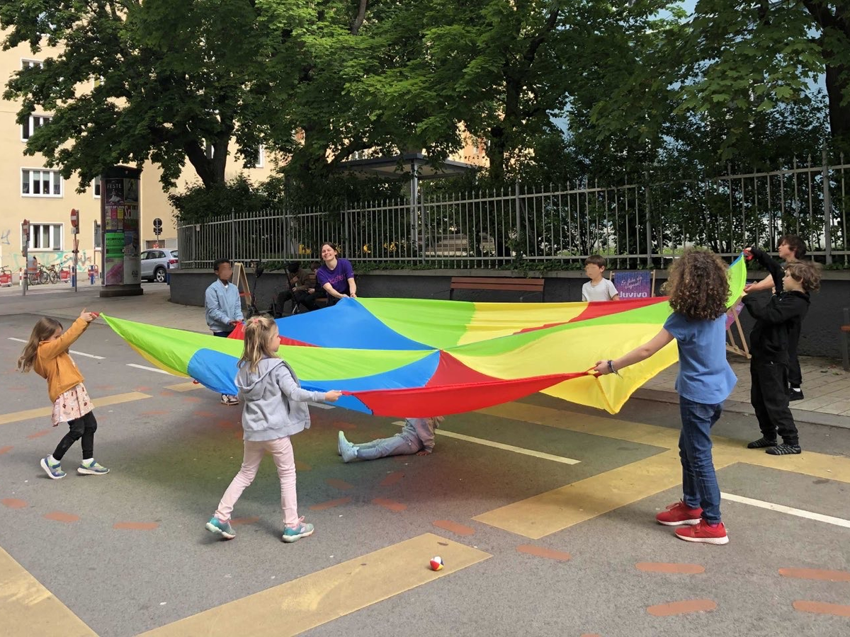 Schwungtücher, Straßenkreiden, Seifenblasen: Bis Juli werden Straßenabschnitte gesperrt, um Kindern mehr Raum zum Spielen zu geben.