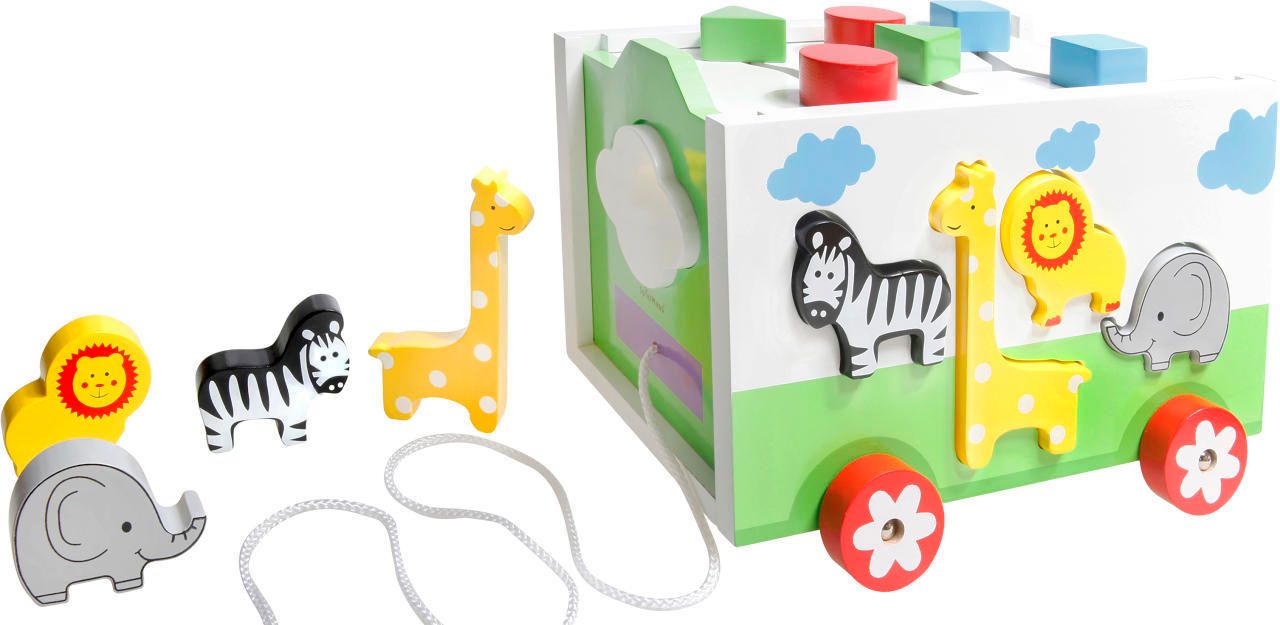 Bei dem Produkt handelt es sich um einen Sortier-Nachziehwagen der Handelsmarke SpielMaus Holz. Credit: Vedes