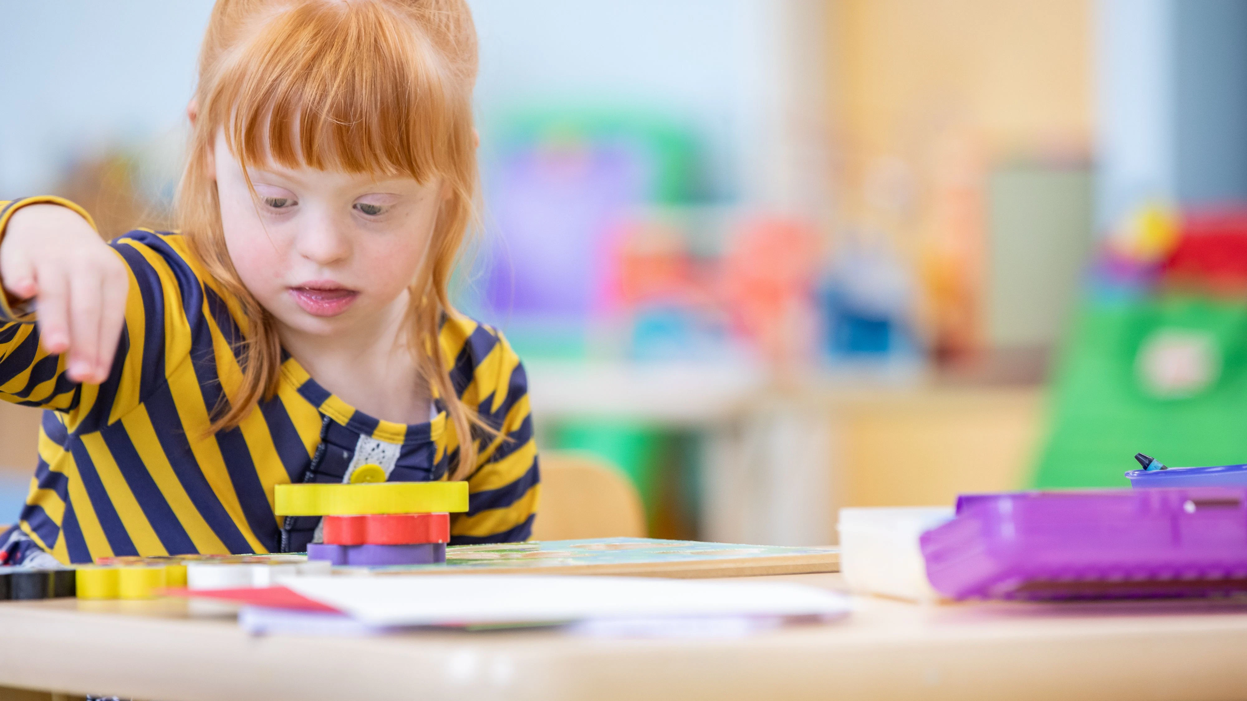 Ein Kind mit Down-Syndrom spielt im Kindergarten – viele Familien kämpfen aktuell mit gekürzter Unterstützung.
