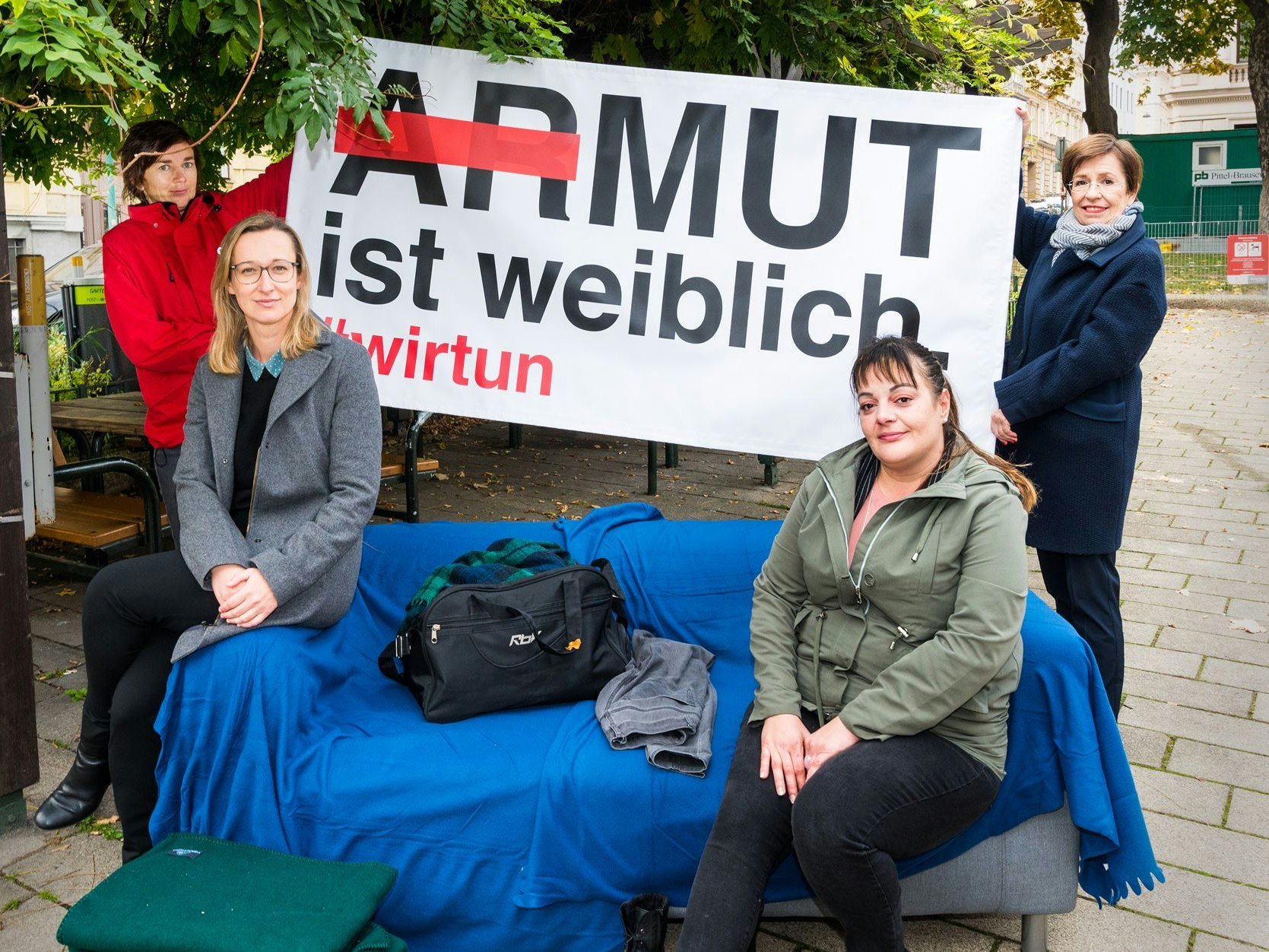 Von links nach rechts: Im Hintergrund Lis Pichler von der Caritas Winternothilfe und Unterstützerin Doris Schmidauer, im Vordergrund Leiterin vom Haus Miriam Maja Markanovic-Riedl und die ehemals von Wohnungslosigkeit Betroffene Anita Antunovic.