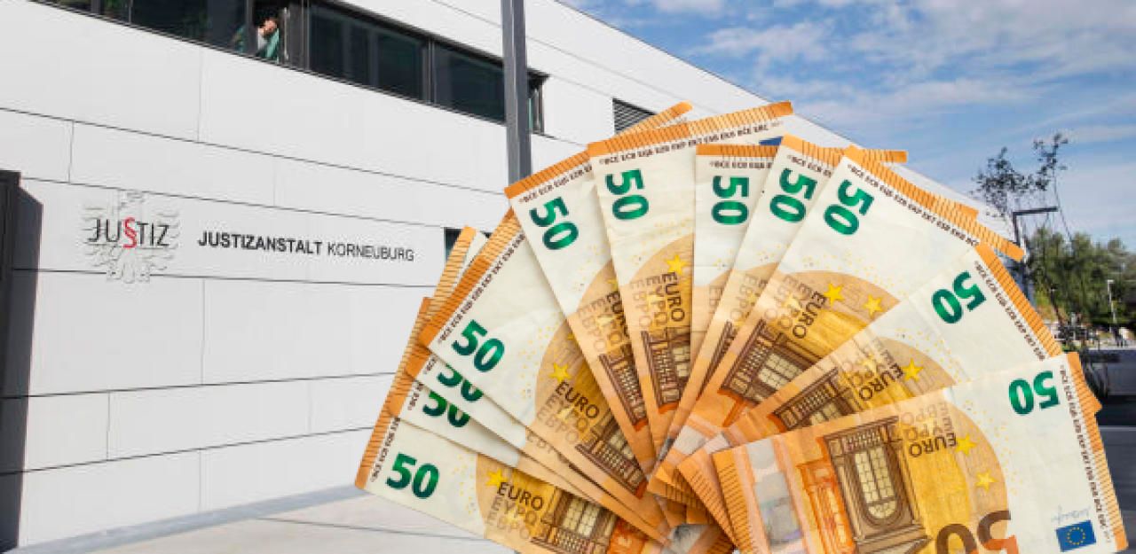 Symbolfoto von 50-Euro-Scheinen und die JA Korneuburg im Hintergrund.