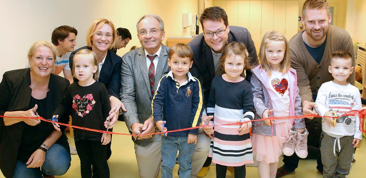 MA-10-Leiterin Daniela Cochlár, Wiedens Bezirksvorsteher Leo Plasch und Bildungsstadtrat Jürgen Czernohorszky (v.li.) mit dem Team des neuen Kindergartens.
