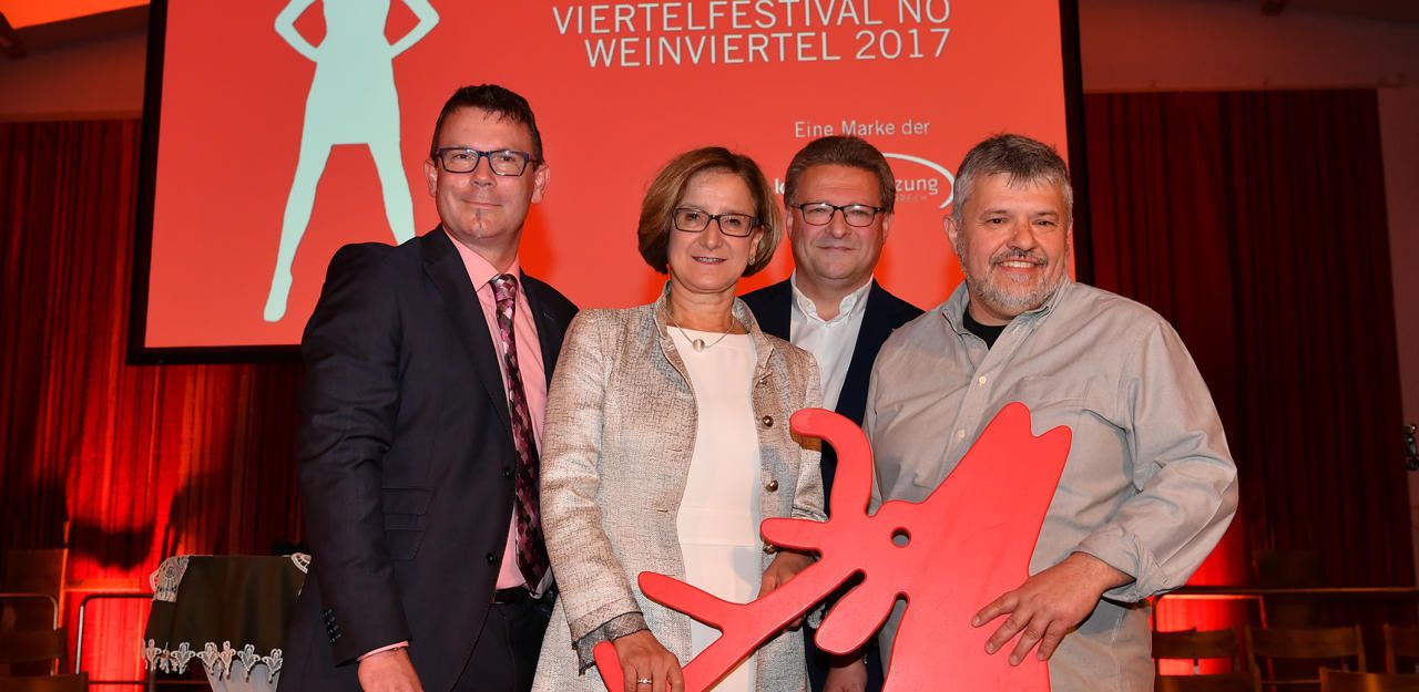 Gruppenbild mit Platzhirsch: Landeshauptfrau Johanna Mikl-Leitner und Niederösterreichs oberster Kulturbeamter Hermann Dikowitsch, flankiert von den beiden Viertelfestival-Masterminds Stephan Gartner und Josef Schick von der Kulturvernetzung NÖ.