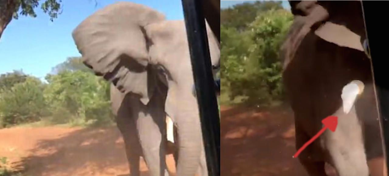Hart: Der Elefant rammt das Auto der Urlauber mit dem Kopf, dabei bricht ein Stoßzahn (Pfeil) ab.