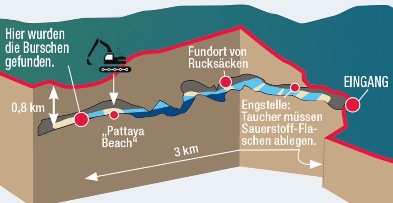 Grafik der Höhle in Thailand, wo eine Jugendfußballmannschaft über zwei Wochen lang eingeschlossen war.
