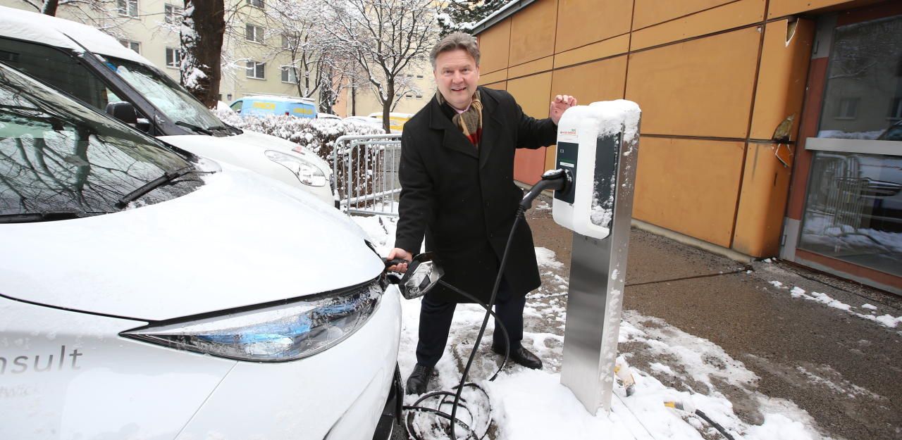 Wohnbau-Stadtrat Michael Ludwig "tankt" eines der E-Autos auf.